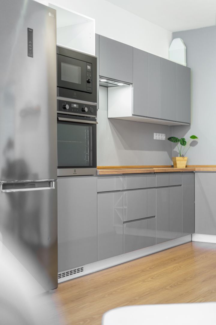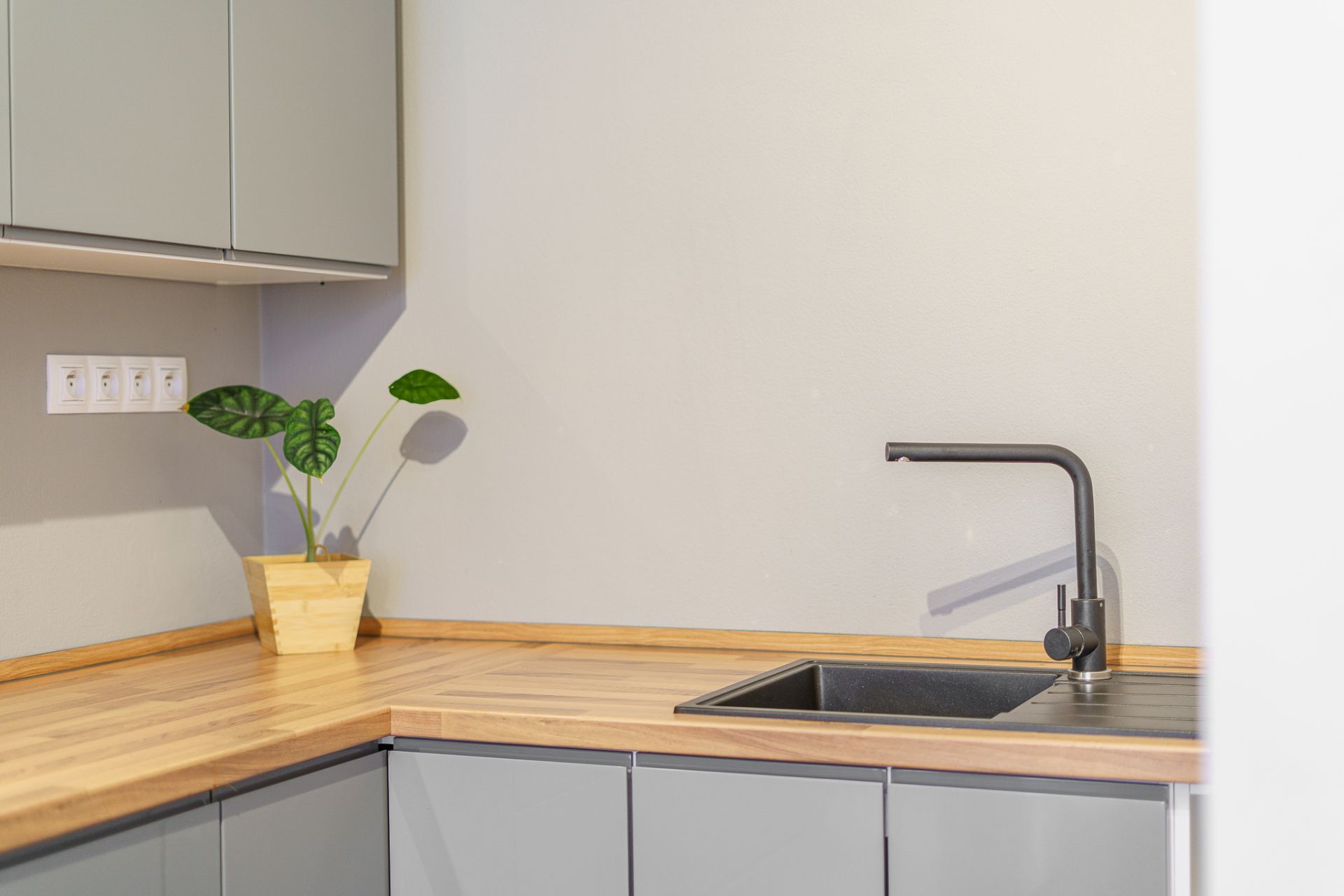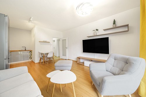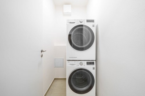 Hlavní obytný prostor nabízí chytré osvětlení, laminátovou plovoucí podlahu a plastová okna s elektricky ovládanými roletami. Moderní kuchyňská linka je vybavena vestavěnými spotřebiči včetně myčky. Součástí prodeje je i lednice.