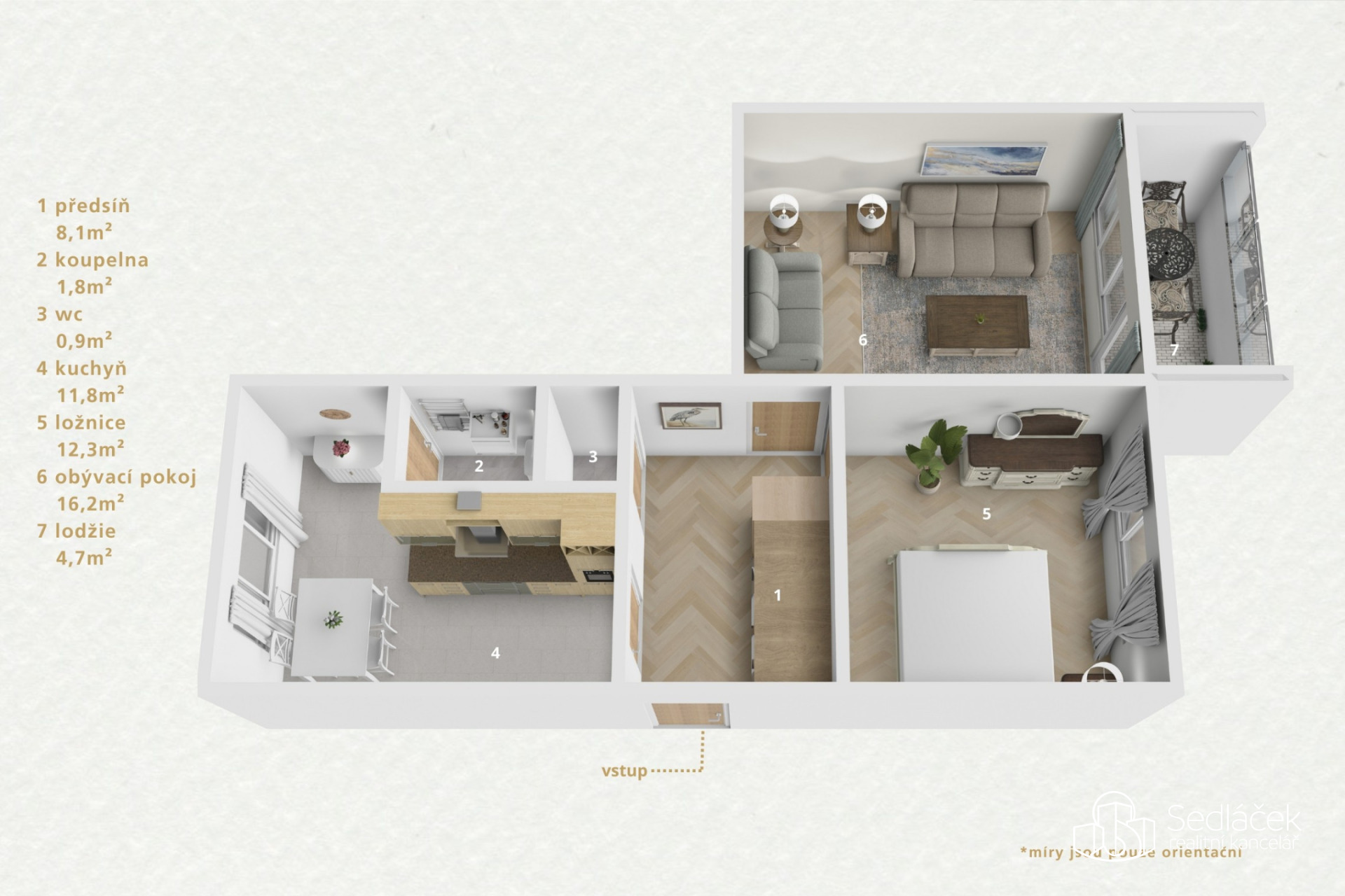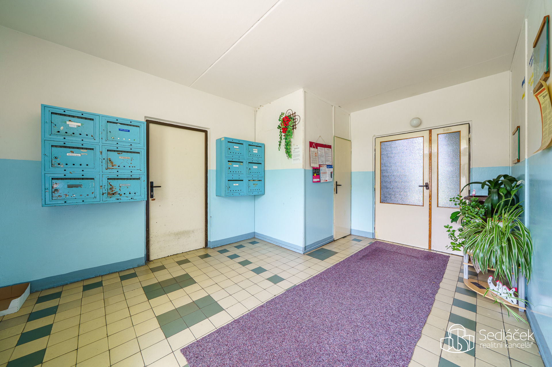 Jednotka je v původním, avšak velmi dobře udržovaném stavu. Dispozice zahrnuje kuchyň, obývací pokoj, ložnici, koupelnu, samostatné WC a předsíň s vestavěným úložným prostorem. Okna jsou plastová. Součástí je také zasklená lodžie a sklepní kóje v mezipatře.